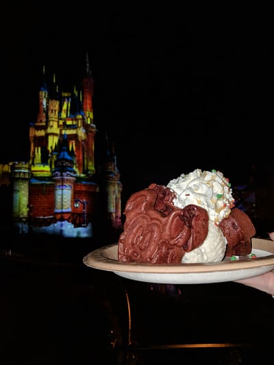 Magic Kingdom has a large lineup of Christmas snacks and desserts, which are available for purchase during Mickey’s Very Merry Christmas Party. Some items are also available only during the event. These include the infamous Yule Log, Red Velvet Zero Waffles, and the Holiday Burger.  Cookies, hot cocoa, and other holiday refreshments come as part of your special event ticket for the party and you can find stations to get these all over the park, along with different cookies served at each of them.
