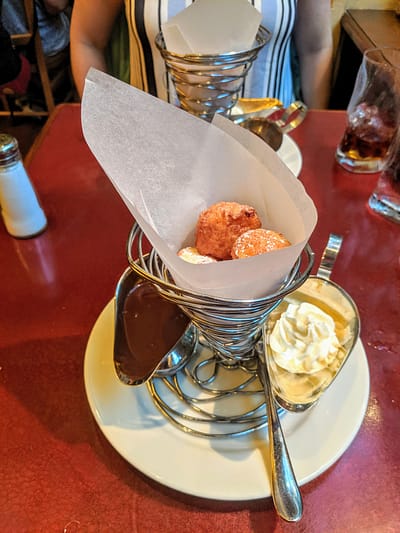 Zeppole di Caterina: Ricotta Cheese Fritter served with whipped cream and chocolate sauce (Both of us because they are SO good!!)