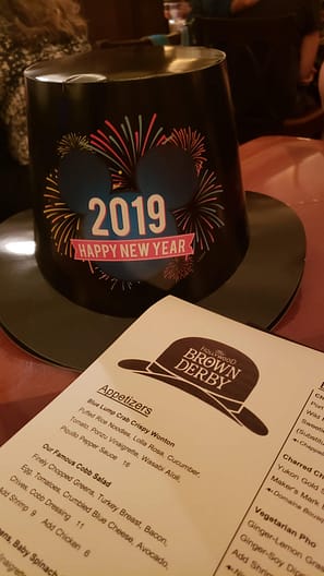 When you arrive to the parks, Disney hands out their official NYE celebration hats and horns which is SO fun and is a nice added touch to make it feel special when visiting on NYE. We proudly wore our hats all night and took some pictures on Hollywood Blvd with the Photo Pass cast members. [Note how much room you have to move around at Hollywood Studios on NYE! ;)]If you have ever visited Magic Kingdom on NYE and then visited Hollywood Studios, the crowd level difference is NIGHT AND DAY. Hollywood Studios felt SO empty and was just how I liked it (lol) Dan and I planned a late dinner at the Brown Derby and I had never eaten there before, so I was excited to try it. [Full Disclosure: I had actually made a reservation at Hollywood and Vine, but Brown Derby became available last minute, so I was able to snag that reservation and change it. Cancelations do happen from time to time, so you can sometimes grab hard to get reservations that way, but know you WILL spend a lot of time looking on the My Disney Experience app, which is why I recommend knowing and booking your reservations 180 days in advance so that you are guaranteed availability and then monitor the app as you get closer to your reservation date.]