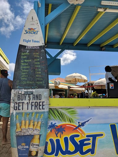 A fun spot near Sonesta Maho Resort to watch these planes take-off is at Sunset Beach Bar. This is my favorite bar on St. Maarten! It is located right next to Maho Beach and is right on the ocean. Some parts of it are over the water! They have great food and drinks and if you’re lucky enough to snag a table on the water, you can watch the planes fly in right from your seat. The DJ will actually announce when the large planes will be coming in for a landing, and they also have a board with all the plane times and airline so you know when to be watching for the big ones! Sunset Beach Bar & Grill also has a pool area where you can rent poolside lounge chairs for the day if you want to hang out there!