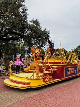 THIS IS HANDS DOWN THE BEST REASON FOR HALLOWEEN AT MAGIC KINGDOM. Ok, can you sense my excitement?! For the first time EVER, the Boo To You parade has been featured during the DAY. This is HUGE. Usually, this is saved for Mickey’s Not So Scary Halloween Party, but this year, Disney gave us the best Halloween gift and gave us special Halloween themed cavalcades! These cavalcades were happening about every 25 minutes or so. The majority of them start in Frontierland and come all the way down Main Street USA. Winnie the Pooh and friends start and end on Main Street doing a loop down to Cinderella’s Castle and back. The music and characters on the floats was everything I needed and so much more. It was so well done and love getting to see these characters and the Boo to You music! These cavalcades are not on a published schedule and will appear randomly throughout the day. I did notice they were pretty frequent, even when it was raining!
