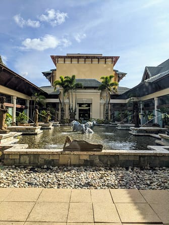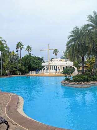 Royal Pacific has a lagoon-style swimming pool, featuring a white sand beach, two hot tubs, a Royal Bali Sea interactive play area, a kiddie pool and private cabana rentals. Currently, pool hopping to other Universal pools has been suspended due to COVID.  There are many poolside activities that include beach volleyball, ping pong, pool basketball, and arts and crafts. The activity schedule is posted for each day at the pool entrance.