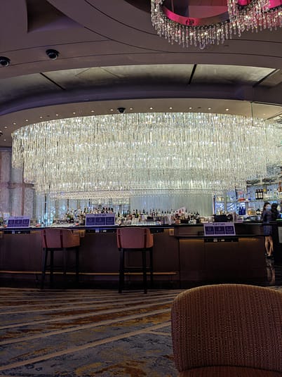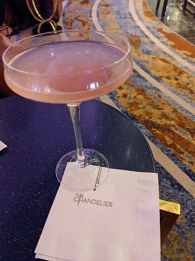 After dropping our things into our hotel room, we headed down to the main lobby area of the hotel. The Vesper Bar and Chandelier Bar are my favorites inside the Cosmo. Because of COVID, you must wear your mask all around the hotel when inside in the public area. Usually, you are able to pick any seat that you would like, but right now, all areas are roped off and you must visit the hostess stand that has been temporarily set up around each of the bars. They will take you to your seat and show you where to sit to help with social distancing. Now here is where things get interesting. Dan and I visited the Chandelier Bar in the late afternoon (around 3:30) There was not a host at the bar, so we were able to walk up and seat ourselves. Once at our table, we took off our masks before even ordering our drinks and receiving them. We went back to the same bar that night before going to dinner (around 8:00) when it was much busier and there was a hostess to show us where to sit. That hostess told us that we had to keep our masks on until we had actually ordered and received our drinks and then could be removed. It was just a little odd considering we had just been there and that was not what we ever told to us. It could depend on who is working and enforcing the rules, so just keep that in mind!