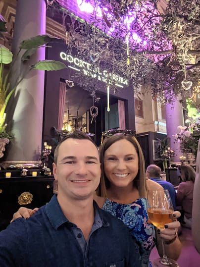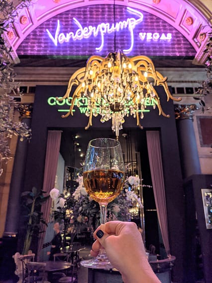 After the fountain show, we kept walking towards Caesar’s Palace (which is right next to the Bellagio). I knew I wanted to visit the Vanderpump Cocktail Garden again located inside Caesar’s Palace, and Dan was such a good sport to go with me! This hotel is also requiring you wear masks inside all public areas. Since we got to the Garden around 4:15 and it had only opened at 4:00, we had no problem getting a table. We were seated right away, but currently, they have their own mask policy they are enforcing- you must keep your mask on at ALL times, even when you have a drink. We had to take our mask on and off to drink our cocktails, and while I wasn’t a fan of doing that (I try to minimize the amount of times I touch my face/mask when I have it on), it was still great to be in the Garden. If you are planning to order food, as soon as the food touches the table, you can take your mask off. This policy was only if you were drinking at your table and not eating. We did sneak a quick picture though since we were far enough away from other tables. ;)