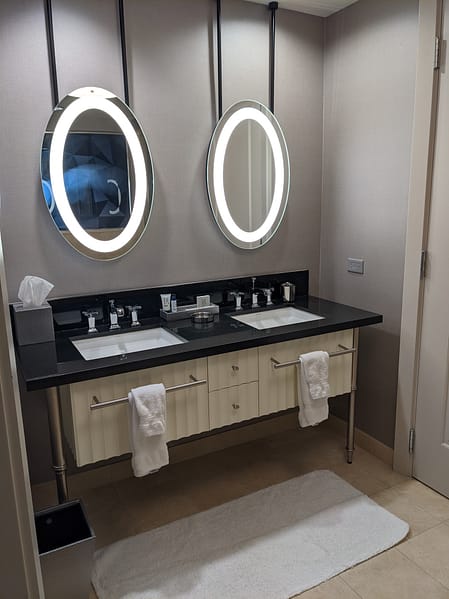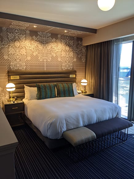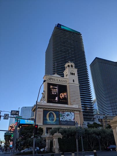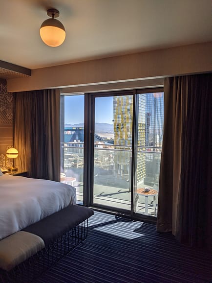 After In-n-Out, we headed to check in to our hotel for the night! We stayed at the beautiful Cosmopolitan Hotel right on the strip! I LOVE this hotel. From the theme, the location, and smell of the hotel (yes, smell lol) I have now stayed here for the 4th time and plan to come and stay here in the future! Originally, I had booked a City Room with 2 Queen Beds. Apparently, luck was on our side (we should have gambled while we were there!) and we got upgraded to a Terrace Studio Room! I was SO excited!! The Terrace Studio has a King Bed with a large, luxurious bathroom that includes a full-size tub. These rooms also come with an oversized private terrace with great views of the city. I had never had a room like that when staying there before, so I was loving the upgrade! Currently, covid protocols require you to wear a mask in all public areas of the hotel. You still have to visit the check-in counter to get your room key and information. You will receive a “Covid Kit” upon arrival in your room that includes 2 disposable masks and hand sanitizer. Rooms are sanitized thoroughly between each guest visit. Room service is currently suspended and housekeeping only visits to bring items upon request. They will not clean your room each day until you check out.