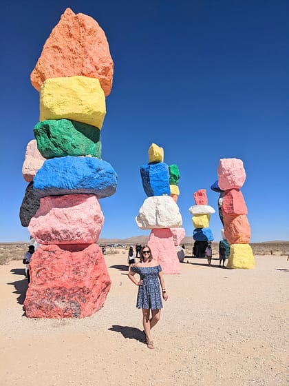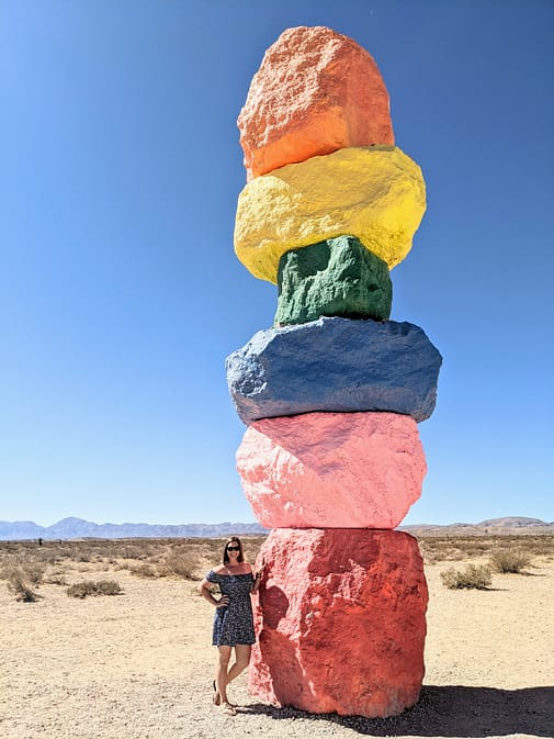 There is no admission fee to visit Seven Magic Mountains. It is free and open to the public. Thre are no restroom facilities or other amenities at Seven Magic Mountains. Make sure to bring water with you when you visit and prepare for hot, dry conditions. Make sure to wear sunscreen, bring a hat, and other protective clothing. Masks are not required since you are outside and are definitely able to socially distance yourself since this location is so large and spread out.