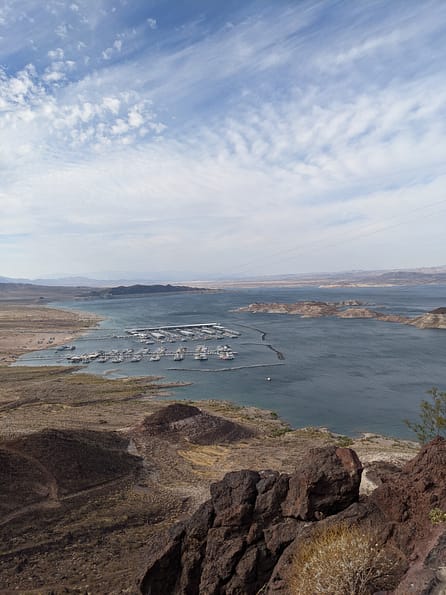 The Mike O’Callaghan – Pat Tillman Memorial Bridge is also known as the Hoover Dam Bypass Bridge. The walking path is accessible from the Nevada side of the bridge and has gorgeous views of the Hoover Dam, Lake Mead, and the high walls of Black Canyon. To reach the walking path’s parking area, proceed as if you are driving to the Hoover Dam, not the Bypass Bridge. The walking path turn off is clearly marked, parking is free and there are portable toilets available. (Note: The walking path is ONLY available once you get through the Hoover Dam security checkpoint. If at any time the Hoover Dam closes again, you will not be able to access it. I didn’t realize this until we got up to the checkpoint and saw the “Closed” signs along with many other cars that were stopping to turn around. If you turn around, continue to drive just about 1 minute and look to your right. You will see a little driving path that you can go up outside of the security checkpoint. Take this driving patch up to the top. You’ll see a small car park which has great views of Lake Mead! Even if you plan to go to the Grand Canyon, I definitely suggest stopping at this little car park to get out and see Lake Mead. It’s was so beautiful getting out and looking down on the lake.