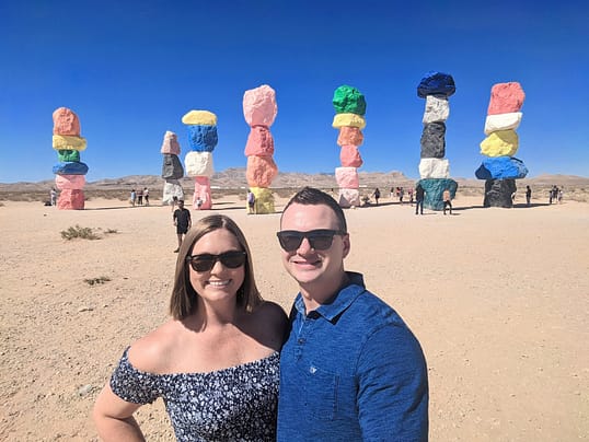 We arrived back in Las Vegas about 1 PM! Our first stop was to Seven Magic Mountains! Seven Magic Mountains is colorful public artwork exhibition located in the desert outside of Las Vegas, featuring seven, 30 to 35-feet high dayglow totems made of painted, locally-sourced boulders. Seven Magic Mountains was intended to be taken down in 2018, but the Bureau of Land Management issued a three-year permit for the display to remain through the end of 2021. If you can visit by the end of 2021, I totally recommend it! You don’t need a ton of time to visit these mountains, so if you have half an hour to spare or want to do something easy during the day in Vegas, put this on your list! Keep in mind, it is VERY hot. There is no shade when you visit here, so wear sunscreen. You are walking out in the middle of the desert to see this, so be careful where you step! We saw some snake holes that of course were scaring me! If you want to visit at a time when it’s not too busy, aim for sunrise! We were there during the middle of the day, so it was busier than I would have wanted it to be.