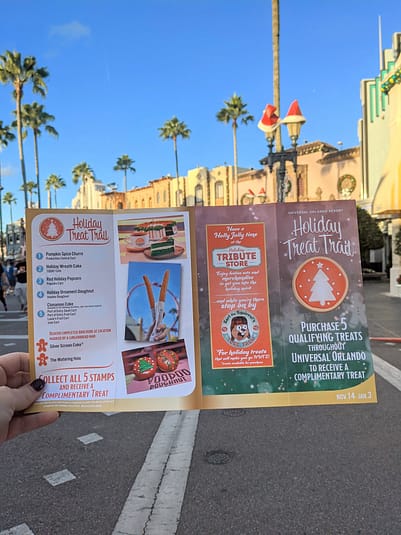 This is my favorite trail to walk! ;) Buy each of the five designated treats throughout CityWalk, Universal Studios, and Islands of Adventure on the Holiday Treat Trail and get a 6th complimentary treat to enjoy. All snacks on the list on the trail are so good! Remember to get your map and have it stamped at each participating location so that way you qualify for your free treat!
