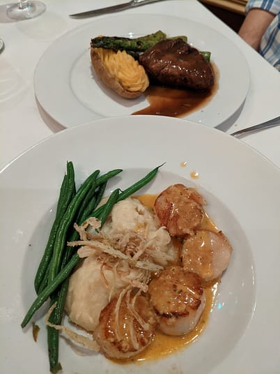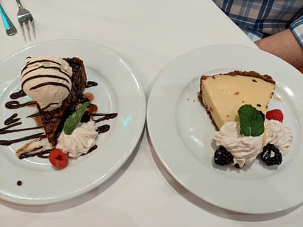 Dan has the filet and I had the scallops. I recommend both of these options. Of course, we had to have a dessert to celebrate Dan’s birthday. Dan had key lime pie and I had pecan pie. SO GOOD!! We finished dinner and walked back to the hotel. (Another great perk of the Hyatt Regency- It is within walking distance to so much which is so convenient!)
