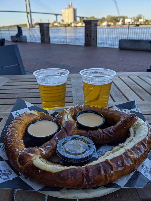 Plant Riverside District: This area is SO cute!! This new plant district is located right on the river. You’ll find tons of restaurants, shops, and entertainment. Even better- during Christmas, you’ll find the Christmas markets! I loved it!! It reminded me so much of Europe getting to visit their Christmas markets, and it definitely made it feel festive and a fun way to spend our evening in Savannah. The Riverside Biergarten had the BEST Bavarian pretzel I have ever eaten in the United States. You can walk up to order food and drinks and then find a seat along the river. When you’re finished and you aren’t staying at the JW Marriott located in the Plant District, be sure to walk through the hotel because what they have done with the old power plant is absolutely amazing. The vision they have created in this area is really cool!