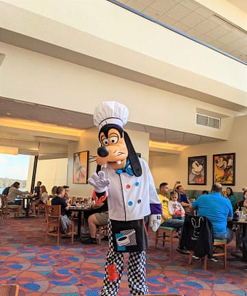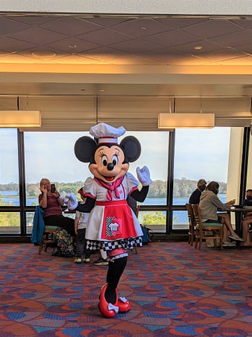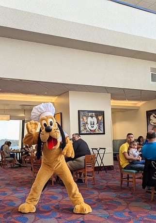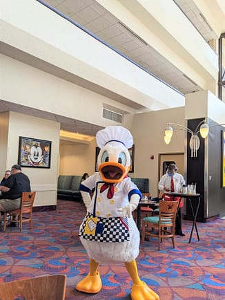 And speaking of characters.. that’s the main reason why everyone goes to this awesome breakfast spot! You’ll see Chef Mickey Mouse, Minnie Mouse, Donald Duck, Goofy, and Pluto- all dressed in their chef’s best! These characters come around every 10 minutes or so, and once they have all made their rounds, they come back out for their “Celebrate with Mickey Mouse” dance. While the napkin twirling dance is no longer available to do, the experience with the characters is still special.