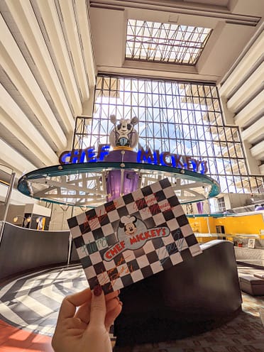 Chef Mickey’s is open for breakfast from 7:30 AM to 12:00 PM. I made a reservation for 11:15 AM because I wanted a brunch type of meal. When we arrived at Chef Mickey’s, you are directed to check in via the My Disney Experience app. Due to new Covid guidelines, you will see QR codes, markers telling you where to stand, and signs directing you on where you walk. I checked in via the app ahead of time, but if you are having trouble working the app, you are able to walk up to the host and they can manually check you in.