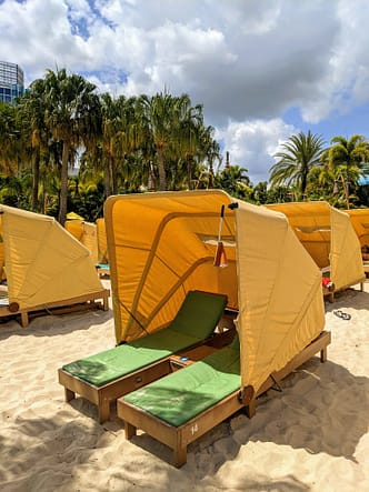 Something important to note is that halfway through the day, the position of the sun will change and you will no longer have shade like you originally started with. The tops of the premium seating loungers don’t move, so you will be directly in the sun in the afternoon depending on where your seats are. However, our seats were perfectly positioned with a great view of the volcano and a really large palm tree, so we were still shaded in the afternoon which was great.