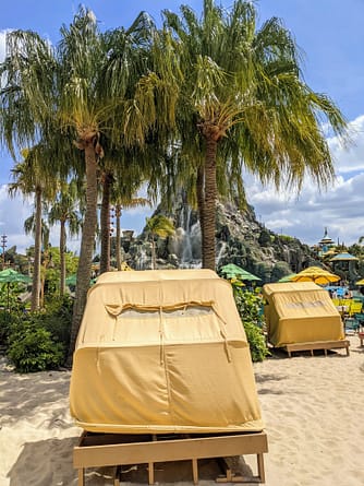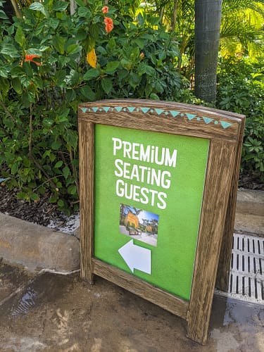 One of the hardest decisions to make when you get to Volcano Bay is where to sit at the water park. If you don’t have a pre-purchased premium seat or a cabana, you will have to find your own chairs (and hopefully an umbrella!) down by the Volcano or in other areas around the park. When you book premium seats, you are guaranteed to have a great location, shaded seating, and an easy-to-find spot when going to and from your seat.