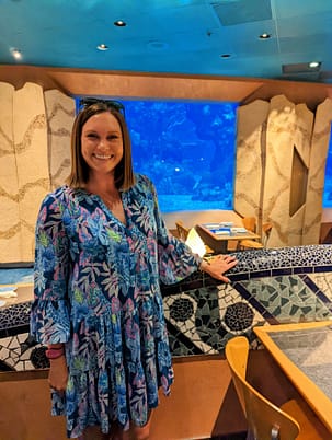 I really enjoyed our meal and experience here! We had a great waiter, the food was great, and I loved the ambiance and theme of this restaurant. I ordered the caesar salad, cajun pasta, and chocolate wave. The portions were very big which was surprising. I was not a fan of the dessert because it had raspberry gelato. I thought it would be a dollop on top of the cake, but it was filled all around the bottom so it was a very overpowering taste. Dan had the key lime tart for dessert and said it was really good because it tasted like a mini-key lime pie. I would definitely eat here again! Everything about my time here was wonderful and I can highly recommend this restaurant. Where else can you eat great food and dine next to sealife?!