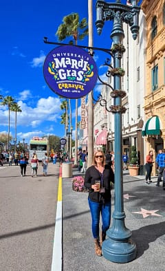 Mardi Gras at Universal Studios is definitely family-friendly and there is something for everyone to enjoy during this event. Kids will love the Mardi Gras Parade. The floats, characters in the parade, and stilt walkers are so fun. You’ll also find dancers, bands, and other street performers during the day at Universal Studios. It’s a great way to catch beads (but be careful and try to cover your head because those beads landing on you can hurt! I would not recommend the concert area, which is a free concert on select nights. This area gets SO PACKED, especially depending on the musical act that night. I would suggest skipping this area if you have little ones on concert nights.