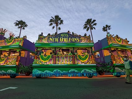 Annual Passholders have the option to apply online to ride on a parade float based on the night of their choice. The other option is to get picked through the Virtual Line. Virtual Line passes are first-come, first-serve with limited availability and will be available from around 3 PM until one hour prior to the parade start. Once available, tap the “Reserve Virtual Line Experience Pass” below and select the number of guests in your party. Choose the available time you’d like to return to ride your float. Float riding experiences last 2-3 hours. You may miss the Mardi Gras concert start depending on the night you are booked to be a float rider. As your virtual line return time, check in at the Animal Actors On Location! one hour to one hour 45 minutes ahead of the parade start.