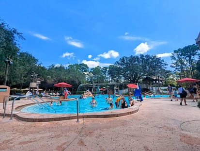 ‘Ol Man Island: This is the main pool for the resort. The pool’s theme is “abandoned sawmill” and features a 95-foot-long waterslide and daily activities and games at the pool. This is the biggest and busiest pool on property. This is where the poolside activities will take place and where you can find a bar with bar service.