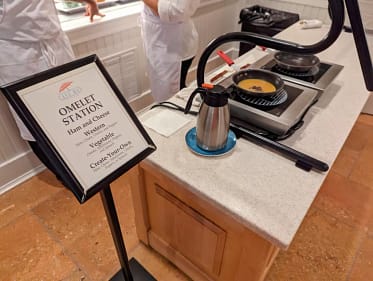 This breakfast buffet includes Mickey and Minnie Mouse waffles, scrambled eggs, potatoes, sausage, oatmeal, fruit, a carving station, and more. There was even a crepe maker with crepes to enjoy! You’ll also be able to order an omelet from the omelet station which was delicious.