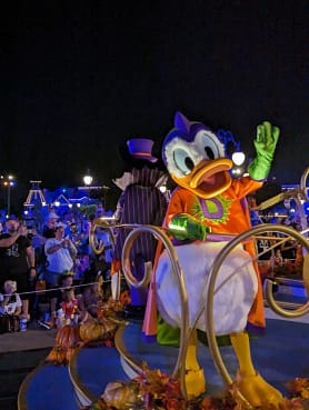 This is the reason that I attend the Halloween Party year after year! I LOVE this parade! This parade is exclusive to the Halloween Party, so you can only see it with your special event ticket. The parade floats feature Disney Villians along with Mickey and all of his friends. You’ll see party-exclusive characters in the parade such as Dr. Facilier, Oogie Boogie, the Wicked Queen, and Before the parade officially starts, the Headless Horseman rides down the parade route and it is such a cool sight to see. Seeing Minnie Mouse, Daisy, and Clarabelle as the Sanderson Sisters on the parade float this year was so fun! They are so cute to see in person. The parade runs twice during the Halloween Party at both 9:15 PM and 11:15 PM. The second parade is less crowded than the first. If you want to catch the first parade, I recommend finding your spot at least an hour before the parade starts. It may seem like a long time in advance, but I was not the only one getting my spot so far in advance! The parade kicks off in Frontierland. This is where I always watch the first parade near Pecco Bill’s Cafe. I can usually find a good seat within that time frame. Doing so allows me to see the parade first, and once it is over, I can make a beeline straight for Pirates of the Caribbean with a wait that is still super low because everyone else is still watching the parade. The second parade I like to watch from Main Street USA is right at the front of the park (near the train station). This allows me to see the parade and as soon as it is over, I can exit the park before the large crowds exit as well once the parade is over. Be sure to get your spot well in advance because everyone wants to try and see this parade!