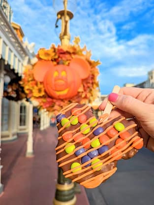 One of my favorite things about the fall season at Walt Disney World is the delicious and fun treats that are offered daily and then specific to the Halloween Party. These treats are sometimes changed up every year. Some of my favorites include the Apple Fritter Milk Shake, Tombstone Tart, Zombie Fingers, and Skull Brownie.