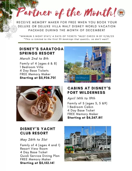 Receive a free Memory Maker when you book your Deluxe or Deluxe Villa Walt Disney World vacation package with a Marvelous Mouse Travels agent during the month of December!