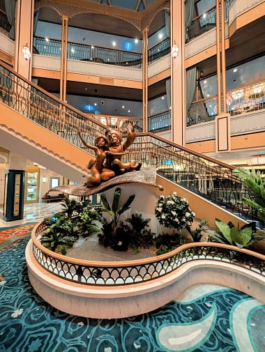The Disney Treasure has an Aladdin theme. As soon as you step inside the ship and enter the Grand Hall, you’ll see a beautiful golden statue of Aladdin and Jasmine flying on their carpet and a gorgeous chandelier with six lanterns. Each lantern represents a current ship in the Disney Cruise Line fleet.